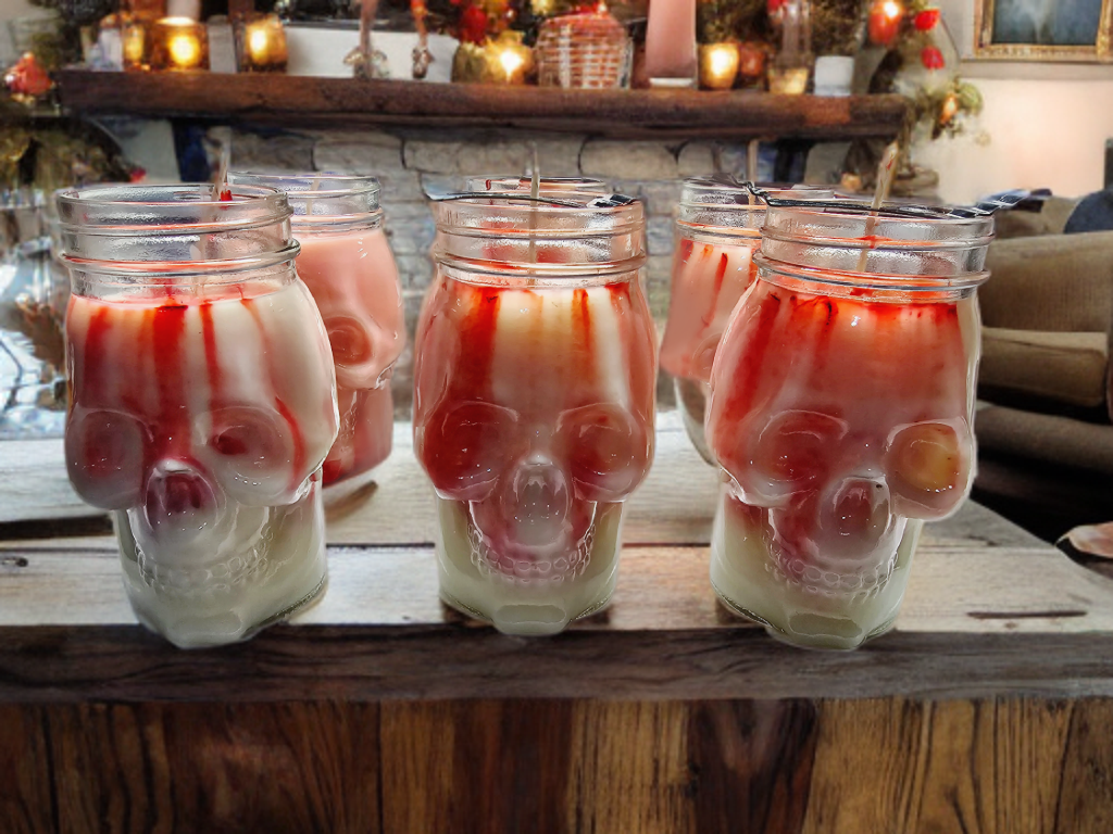 Dare to light the night with our Hallows-Eve Skull Candle—a hauntingly beautiful 16 oz soy wax candle that brings eerie elegance to your fall decor. Each candle is hand-poured into a detailed skull-shaped jar and dripped with blood-red wax for a dramatic, gothic finish.